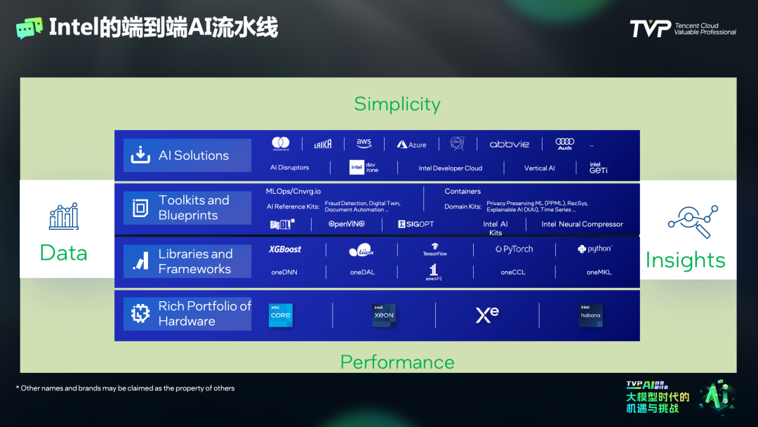 戴金权老师首先分享了英特尔团队在生成式人工智能领域的工作。他提到,影响生成式 AI 的众多因素中,算力是非常重要的支撑因素,英特尔针对端到端的 AI 的流水线如何提升效率、如何对 AI 加速进行了针对性的优化。