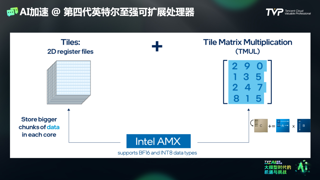 在英特尔最近发布的 Gaudi2 深度学习加速器中,与 Hugging Face 合作进行模型优化。同时,英特尔在服务器上加入了 Intel AMX,其由两部分组成:一个是 2D 的寄存器文件,另一个是矩阵加速支持。戴金权老师提到,这样做的好处在于能够在通用 CPU 的服务器上实现硬件加速的能力,在通用计算的场景下具有一定意义。