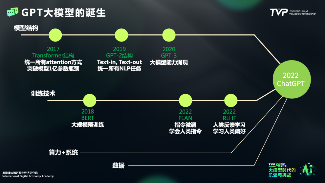 谈及 GPT 大模型诞生的历程,张家兴老师从十余年在深度学习领域的资深研究经验出发,用模型结构、训练技术、算力+系统和数据四条主线来阐述整个技术发展的背后趋势,并重点分享了几个关键节点: