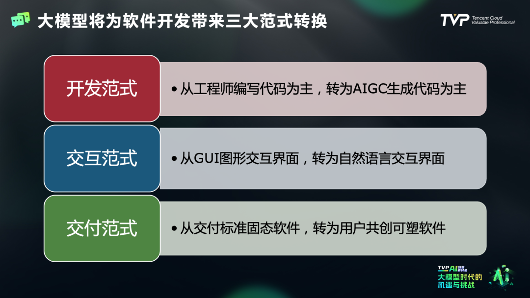 同样,在软件领域,李建忠老师分享了大模型为软件开发带来的三大范式转换: