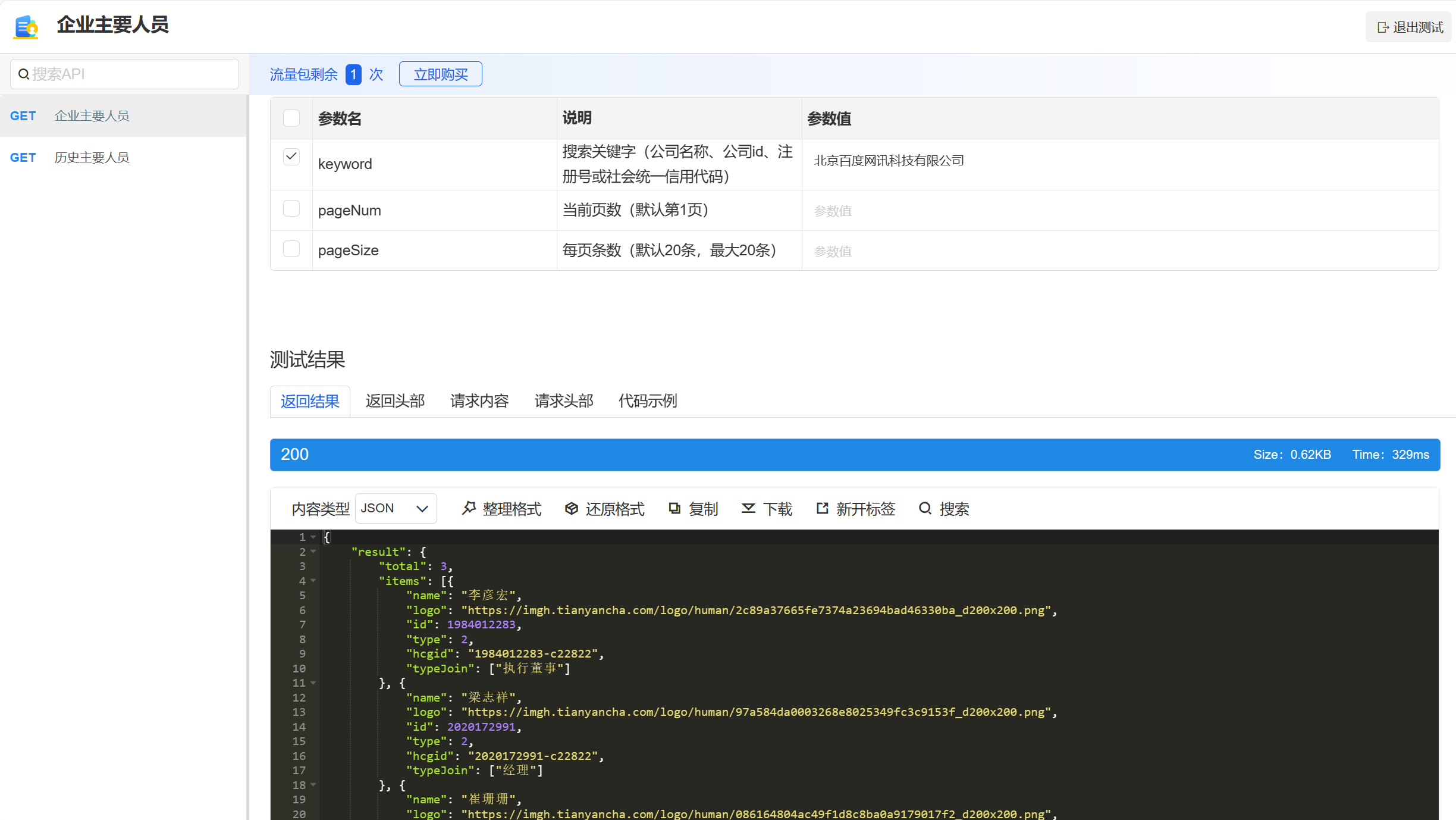 申请接口成功,进入测试页面,输入要查询的企业信息快速在线测试。