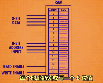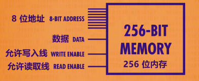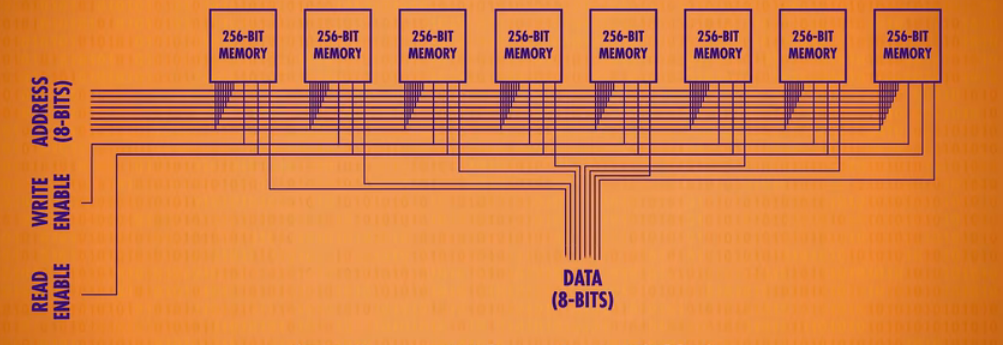 8-BIT ADDRESS INPUT:代表的是这八个256位内存中使用的同一个行列,因此这个RAM有256个地址,而每个地址都可以读写一个8位的值,也就是可以存储256X8位的信息,也即256个字节(byte)