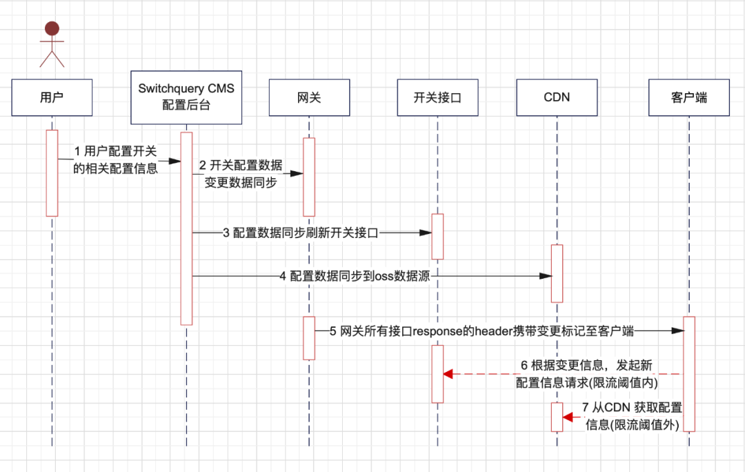 由于推送push消息方案存在触达比例低的问题,长链接存在耗费服务器资源的缺点,同时轮询的方案也存在很多无效的网络传输等弊端,因此以上三种方案都不是Switchquery 配置平台的触达方案的最佳技术选型。通过调研,采取了一种配置信息从服务端实时触达到客户端的新方案,方案的具体描述为:先搭建一个信息配置管理CMS平台,同时构建一个客户端获取配置信息的客户端组件,由用户在CMS配置信息,然后由CMS后台将配置信息的版本号信息同步至统一网关,所有客户端请求到达统一网关,并在返回的接口数据的header内都会携带最新的版本号至客户端,客户端对比发现新的版本号比缓存的版本大则请求配置信息拉取Switchquery配置接口,这样只要App打开就会存在接口携带变化标志返回,这样就会触发客户端主动发起请求更新配置信息,提高了实时性,不受push开关权限控制和影响,不需要额外打造长连接通道,具有低成本,实时性高等优点。以下是Switchquery配置平台的时序图: