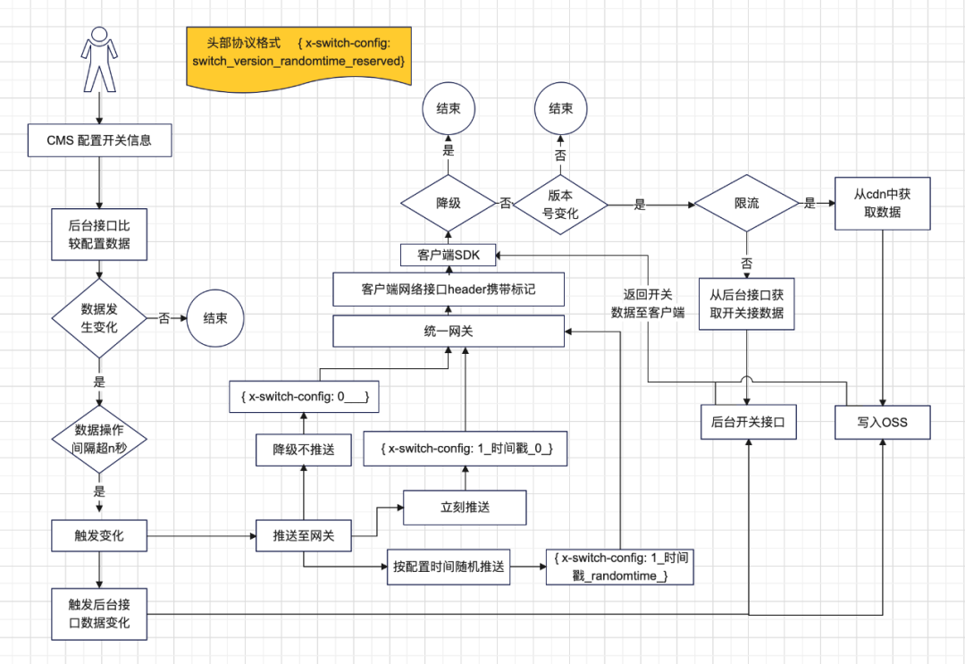 4) 客户端网络框架在客户端会不间断随机广播全局通知, 开关客户端组件收到通知后,获取到统一网关的返回数据,解析网络接口返回的header部分,获取x-switch-config字段,解析字段中的value,如果是降级,则结束,如果版本号没有发生变化,则结束,如果非限流同时 switch=1,并且本地的缓存的开关version小于解析后的version,则根据randomtime随机数发起客户端请求;如果服务端返回了特定的限流码则客户端直接从CDN拉取配置信息数据并更新本地缓存数据,如果服务端正常返回则获取开关数据并更新本地缓存。