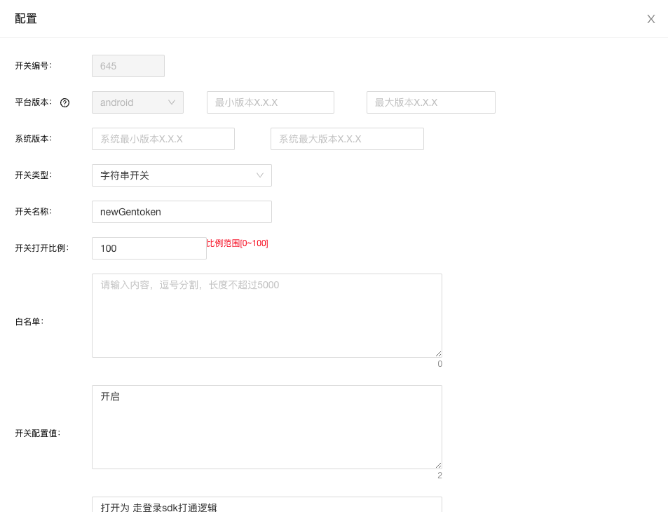 8) 开关配置值:布尔开关默认不展示,整形或者字符串类型的配置类型需设置开关值;
