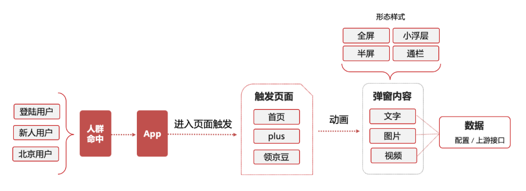 首先确定需要投放的人群,而其他人群将不会命中,这里是为了防止对非必要触达人群的干扰。当弹窗的配置信息下发给客户端后,App 在适当时候、适当的页面触发弹出,而弹窗的展示形态可以是多样的,包括但不限于:全屏、半屏等。