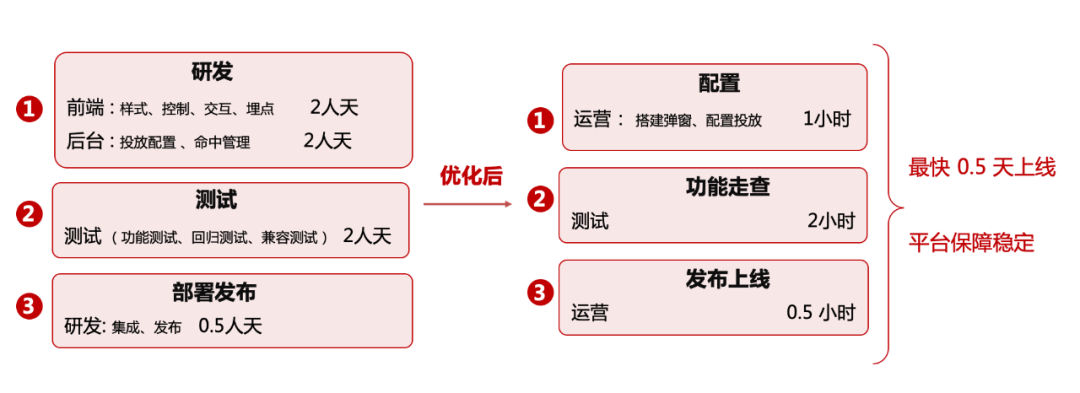 尤其后续一些考虑 h5 实现的弹窗,完全可以迁移到这套搭投系统中,通过对比 h5 弹窗开发(图左侧)及搭投的方式(图右侧),可以大致看到使用搭投系统的优势: