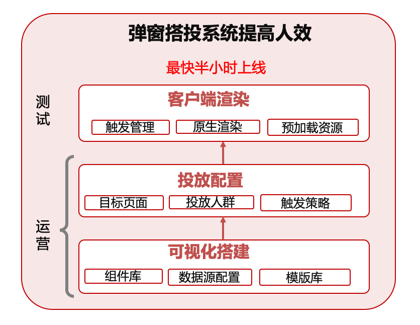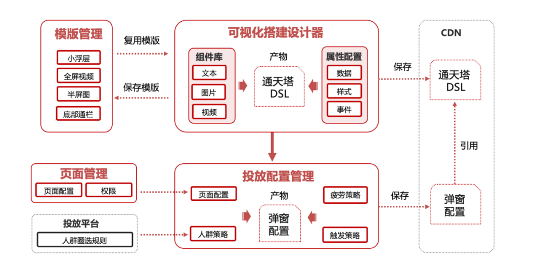 搭投平台的建设主要有俩个目标,一是支持高效的搭建弹窗预览内容,二是支持快速配置投放规则,以下是一个设计图: