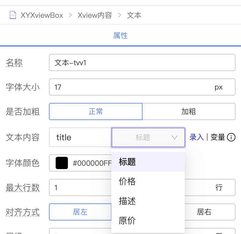 在上图案例中,通过接口的编排和配置,XView 将图中所示 “接口1” 作为数据源,此接口输出标准化命名的变量,让搭建设计器可以识别变量的意义并展示为中文提示。然后组件的属性可以选择绑定这些输出的 “变量”。如下图所示,这是在设置一个文本组件的文本内容属性,这里选择绑定了输出的标准变量列表中的 “标题” :