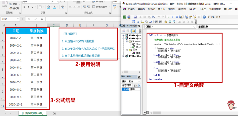 上述的代码是自定义了一个「日期转换季度」函数,这个案例之前出现在实际的工作场景中,当然了这个公式是简化版的。