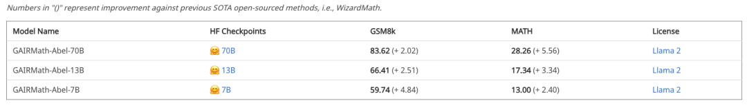 我们在开源LLMs(不使用外部工具的模型)上建立了GSM8k(83.62)和MATH(28.26)基准的SoTA。具体来说: