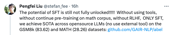 SFT的潜力仍未完全释放!!!无需使用工具,无需在数学语料库上进行持续预训练,无需RLHF,仅仅使用SFT,我们在GSM8k(83.62)和MATH(28.26)数据集上实现了开源LLM的SoTA(不使用外部工具):https://github.com/GAIR-NLP/abel。