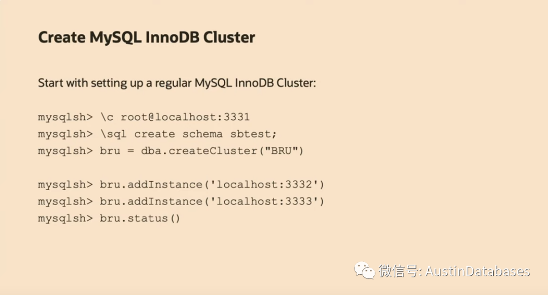 同时我们针对区域中的集群不非要是3台主机,这里一个区域也可以是一台主机。这里我举几个例子,因为时间的原因可能这些例子不是完整的。这里我们通过MySQL Shell进行登录,然后建立一个高可用的模式,并添加节点。在MySQL底层配置一些设置后,这些都不需要SSH的支持,这些都是通过MySQL的connection来进行的,使用这个命令你就可以建立一个Mysql 集群非常非常简单。这里你可以通过他来进行那个是主,配置参数的改变,所有的操作都在 MySQL Shell中。