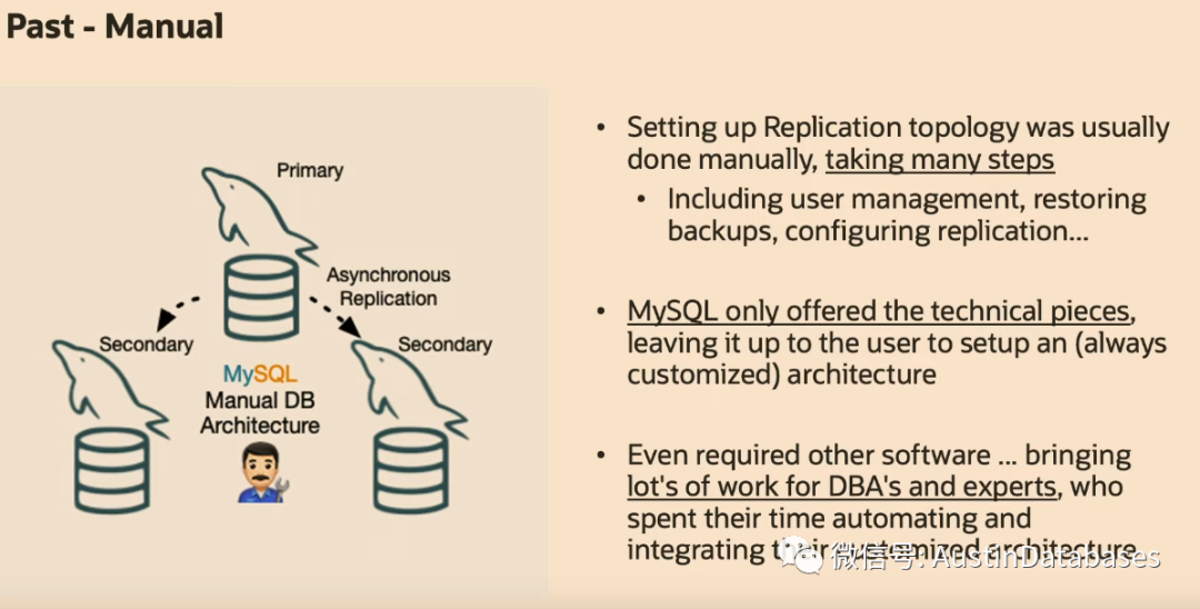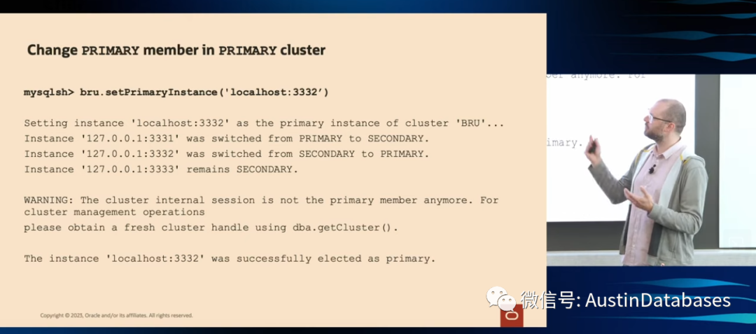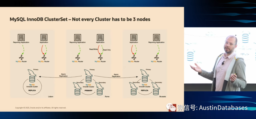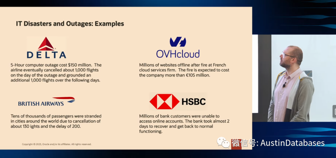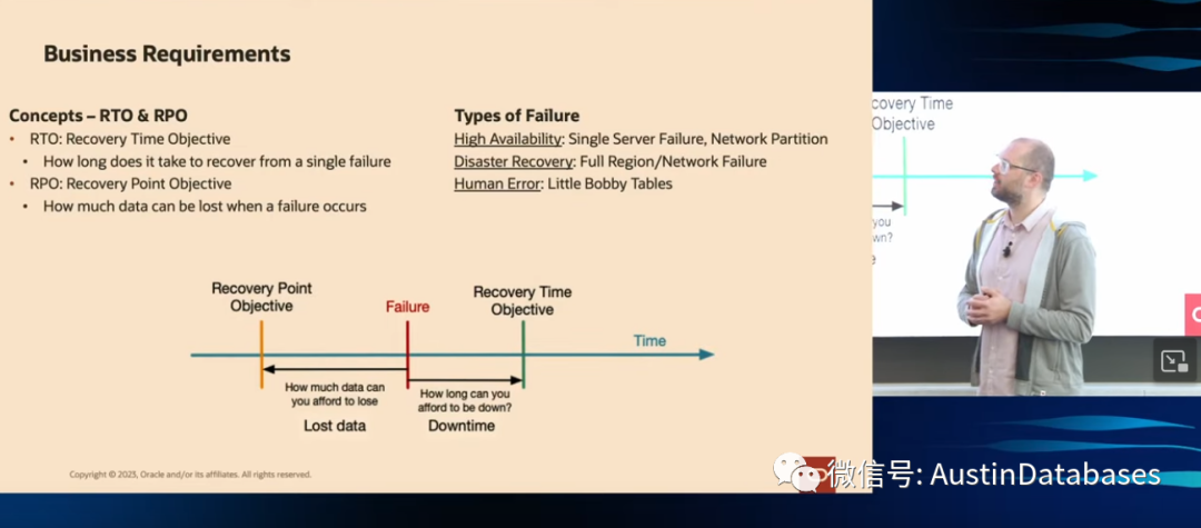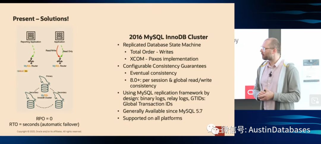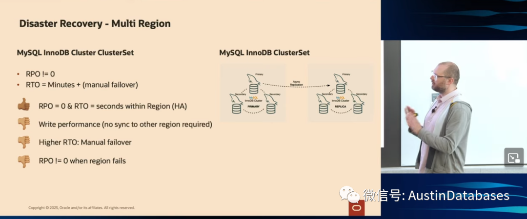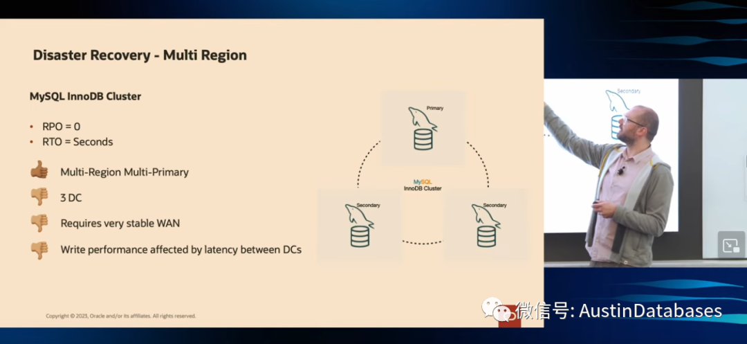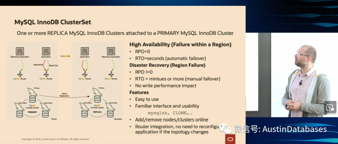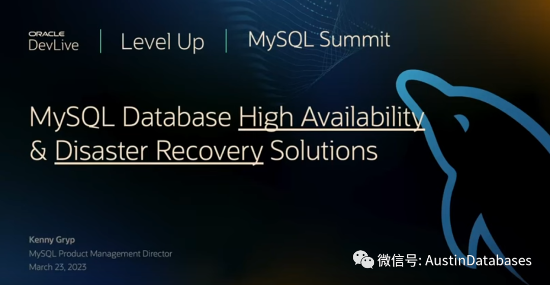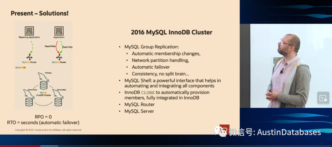 相对于其他的数据库厂商大会,MySQL的的确寒酸,连幕头都没有,上来就直接讲,不过也符合MySQL一贯的风格。这次翻译的是 2023年MySQL summit -- MySQL high availability and disaster recovery。开始本次的讲解人是 MySQL的产品经理,明显和我之前听的MongoDB的两期差距较大,一看是不善言辞的人。