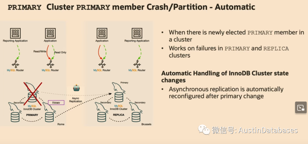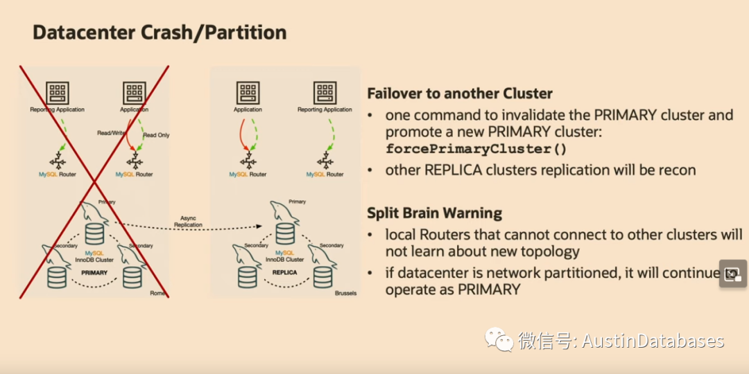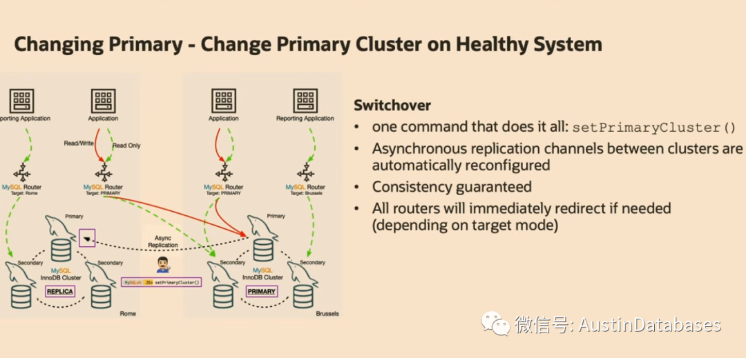 在2020年,我们有了innodb clusterSET 在之前的高可用基础行,进行了一个补充,我们将我们的功能添加到MySQL Shell,然后添加一个从库或多个从库我们这里要做的就是灾难恢复,我们在两个区域之间配置异步复制,两个或多个区域,添加的区域数量没有限制,通过这种方式我们可以使用MySQL Shell来简单的切换到布鲁塞尔的集群上,使其成为主集群。他会重新配置所有的内容,所有的这一切都是一个命令就可以解决,当然区域之间可能有数据丢失。