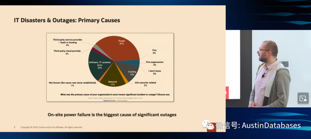 大家好,我是MySQL的产品经理,我本期为大家介绍的是 MySQL的高可用和灾难恢复上的一些新的解决方案,这里我们先看这张图,在数据库的故障中,关于产生故障的原因有有很多种,饱含电力,网络,数据服务器中心,制冷等多种故障