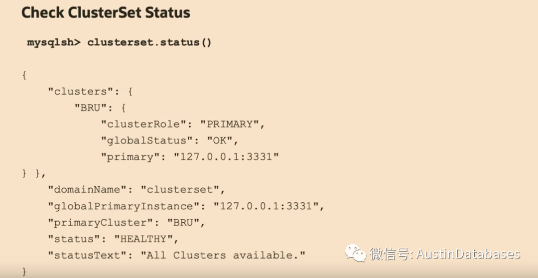 通过clusterset.status() 命令可以看到当前的集群的状态,以及那个是主节点等信息。