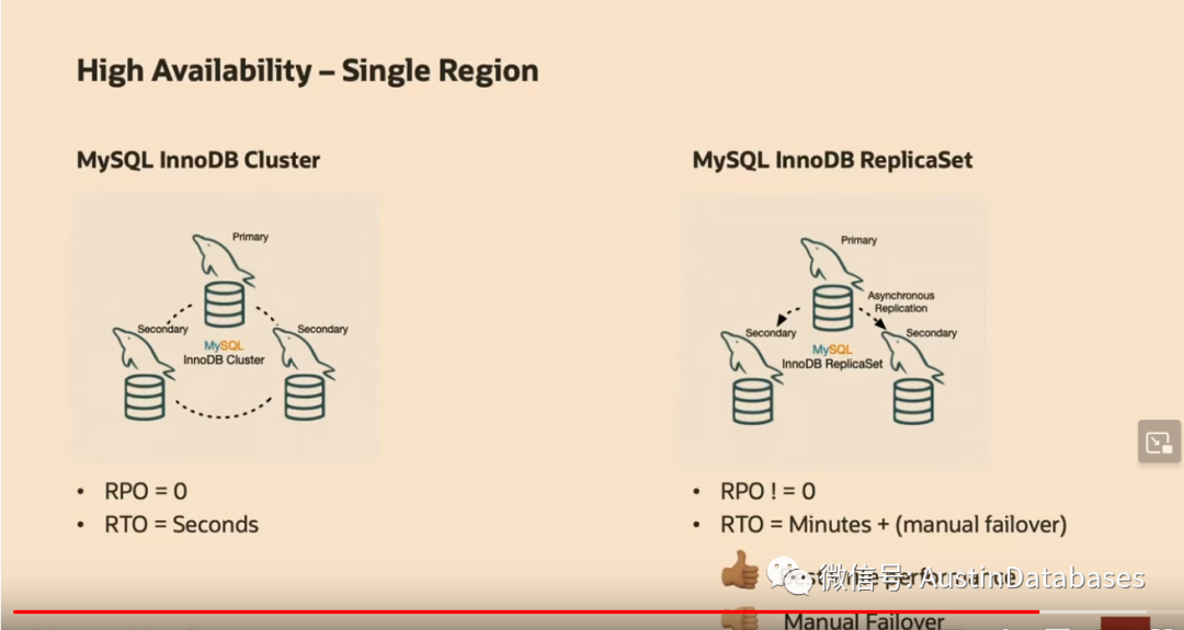 这里RPO为0说明不会丢失数据,如果我们采用异步的方式,并未网络出现问题可能会丢失几秒的数据,具体还和你网络带宽有关,RTO为我们需要多长时间来进行数据的恢复,我们都希望RPO=0 没有数据丢失,RTO=0我们立即恢复数据,但从高可用的角度来看,但这里实际上我们的需求是不一样,如果你只是单区域,那么你在意的是你数据库的高可用,但如果是灾难恢复,则你需要注意的是你的多区域的设置。当然还有人为的误删除数据,或SQL注入等问题,那么你需要做的是通过备份来恢复,或者通过延迟节点来进行相关的工作。所以我们这里介绍的部分,是不能
