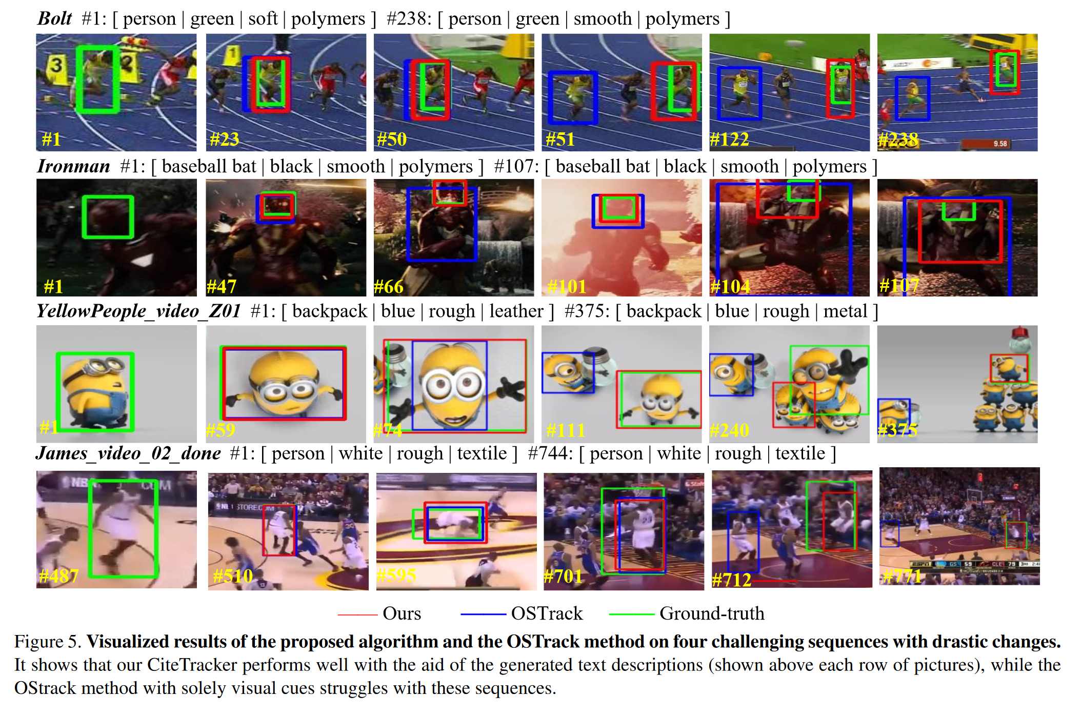 为了从我们提出的跟踪算法中获得更多见解,我们将几个具有挑战性的序列的跟踪结果与 OStrack 进行比较可视化。 Bolt 序列的特点是快速移动的目标和与参考目标非常相似的对抗性示例。我们的跟踪算法可以准确地跟踪目标,而 OSTrack 在第 51 帧时无法跟踪目标。在《Ironman》系列中,尽管光照变化很大,我们的跟踪器仍能准确跟踪目标,而 OSTrack 则不然。此外,即使在 YellowPeople 序列中存在对抗性样本和目标外观变化的情况下,我们的 CiteTracker 也能准确定位目标并将其与类似的干扰物区分开来。尽管詹姆斯序列中的视点频繁变化,我们的跟踪算法仍然表现良好。图 5 另外显示了每个序列的目标的生成文本描述,包括类别、颜色、材质和纹理。对同一目标的大多数描述在不同帧中都是一致的,但变化很大,这证明了文本描述对于跟踪的鲁棒性。由于用于训练的 COCO 数据集有限的 80 个类别,预测类别可能与真实对象类别不同,但在视频的大多数帧中保持一致(图 4 中的统计结果也支持),有利于目标识别和本地化。