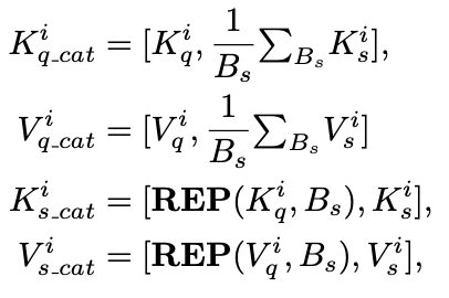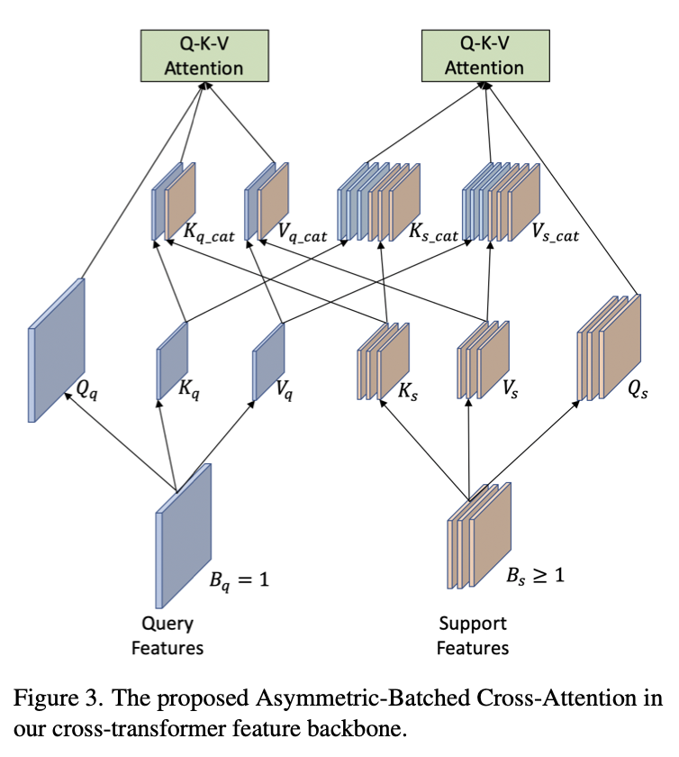 在cross-transformer中计算Q-K-V attention时为了减少计算量,研究者采用了PVTv2的方式。上面大致介绍了query和support特征提取,在特征交互上作者提出了 Asymmetric-Batched Cross-Attention。具体做法如下图和公式所示: