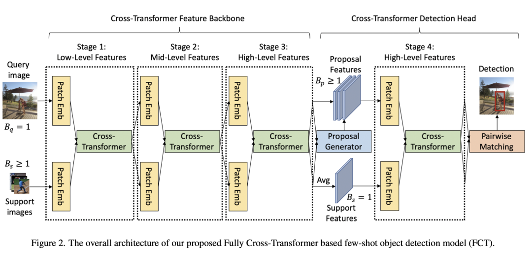 研究者认为以往的two-branch方法只关注了detection head部分的特征交互,忽略了特征提取部分;于是这篇论文的motivation就出来了。因此研究者在Faster RCNN上提出了Fully Cross-Transformer(FCT)的小样本检测方法,在每个阶段都进行特征交互。如下图所示: