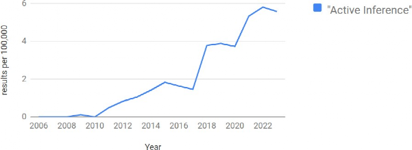 图3。NCBI PubMed上“主动推理”(蓝线)每100,000人被引用的比例2006年至2023年7月31日。在最近一年(2022年),总共1,772,674篇出版物中有103篇引用了“主动推理”。