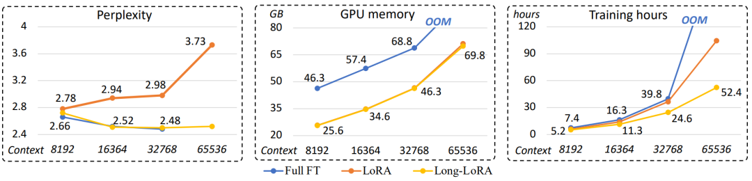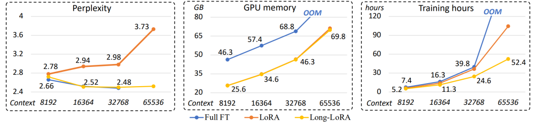 「在效率方面」,无论是否采用 LoRA,随着上下文大小的扩展,计算成本都会急剧增加,这主要是由于标准的自注意力机制,如下图所示,即使使用 LoRA,当上下文窗口扩大时,标准 LLaMA2 模型的训练时间也会大幅增加。
