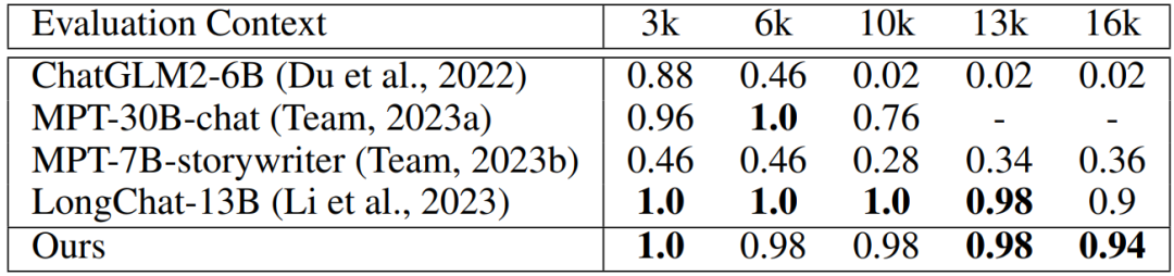 利用LongLoRA微调得到的LLaMA2模型,与其它开源模型进行对比。可以发现与最先进的模型LongChat-13B性能相当。
