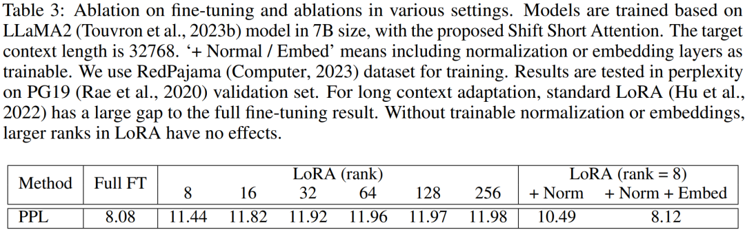 实验表明,可学习的嵌入和归一化层是解锁长上下文 LoRA 微调的关键,如下表所示。嵌入和归一化层在整个 LLM 中只占参数的一小部分。例如,LLaMA2 7B 中的嵌入具有 (< 2%) 个参数,归一化具有 (≤ 0.004%) 个参数。对于更大的预训练模型,这个比率会下降。