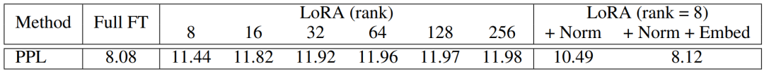 「在效果方面」,简单的低秩自适应会导致长上下文扩展中的高度困惑,如下表所示将秩增加到更高的值并不能缓解此问题;