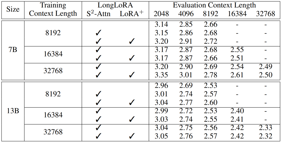 利用RedPajama数据集进行训练,使用 LongLoRA 微调的模型可以发现随着评估上下文长度的增加复杂度逐渐降低。