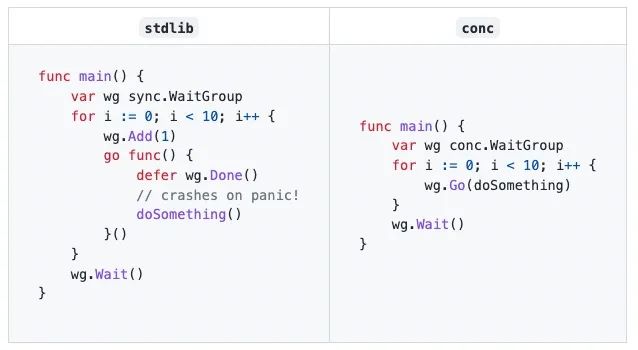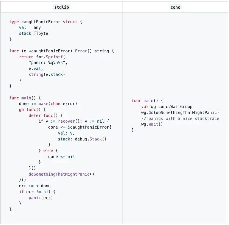 原生 Go 要生成大量无用代码,我司 repo 运动式的清理过一波,也遇到过 goroutine 忘写 recover 导致的事故。conc 同时提供 catcher 封装 recover 逻辑,conc.WaitGroup 可以选择 Wait 重新抛出 panic, 也可以 WaitAndRecover 返回捕获到的 panic 堆栈信息