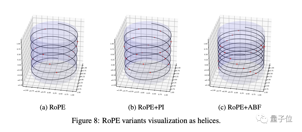 在附录中,Meta还通过可视化为螺旋图这一非常有趣的方式,将RoPE ABF与RoPE PI的差异进行了理论分析。