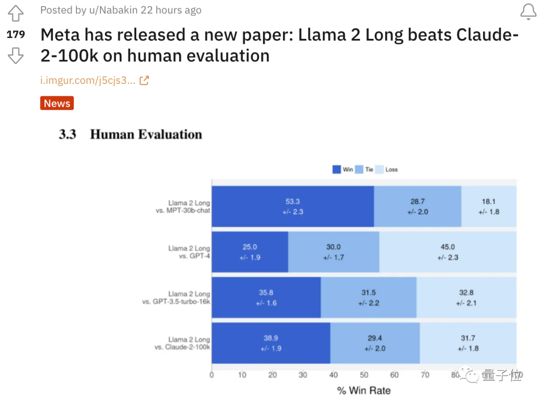 在人类评估(human evaluation)上甚至优于10万token的Claude 2,这个话题还在Reddit上引发了讨论。