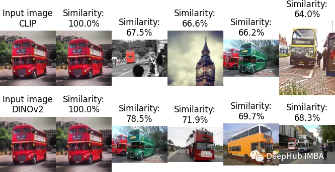 这里DINOv2大幅领先的一个原因是MetaAI使用DISC21数据集作为其模型的基准,这肯定会给DINOv2带来有利的优势。但是我们可以看到在COCO数据集上的测试中显示了有趣的细微差别:DINOv2在识别图像中的主要元素方面表现出更高的能力,而CLIP在专注于输入图像中的特定细节方面表现得很熟练(看看 bus那个图像,CLIP找出的全部是红色的车,这可能是因为它与文本对齐时包含了颜色)