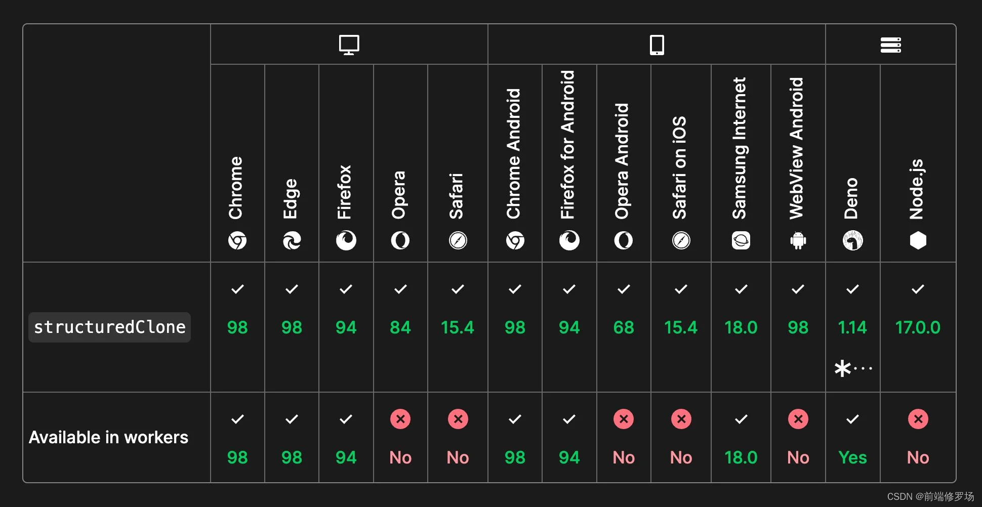 所有主流浏览器都支持 structuredClone,甚至Node.js和Deno。