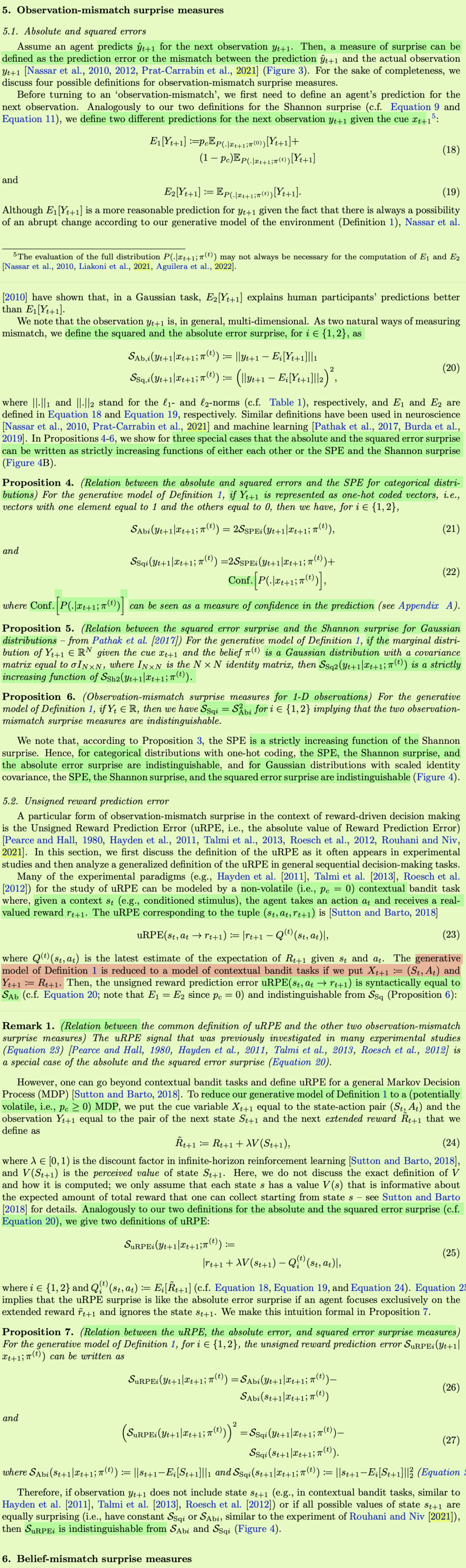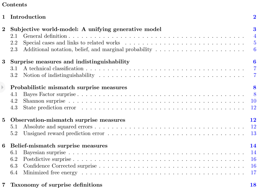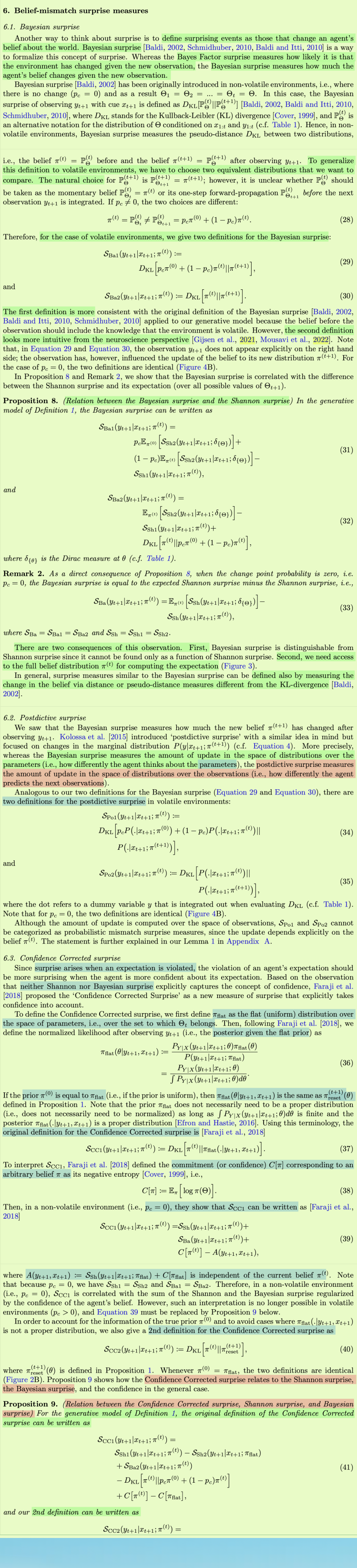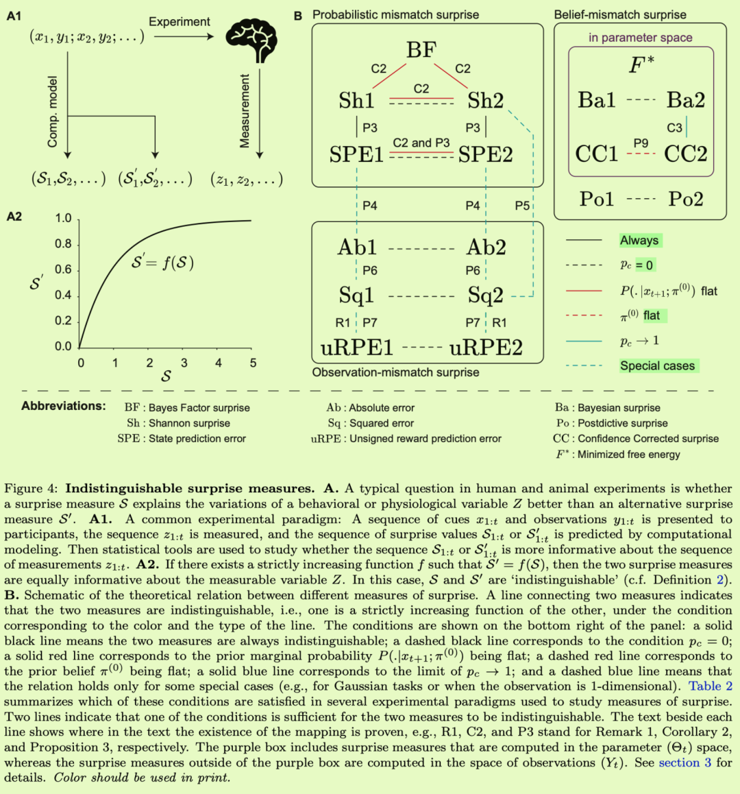 在过去的几十年里,人们提出并研究了不同的惊喜定义和正式衡量标准[巴尔迪,2002年,Gl ascher等人,2010年,施密德胡伯,2010年,弗里斯顿,2010年,帕尔姆,2012年,巴尔托等人,2013年,科洛萨等人,2015年,法拉吉等人,2018年,利亚科尼等人,2021年]。这些惊奇测量在解释惊奇在不同大脑功能中的作用[Itti和Baldi,2006年,Gershman等人,2017年,Xu等人,2021年,Rouhani和Niv,2021年,Antony等人,2021年,Findling等人,2021年]和识别行为和生理测量中的惊奇信号[Mars等人,2008年,Gl ascher等人,2010年,Rubin等人,2016年,modirsh然而,仍有许多未解决的问题,包括但不限于:(1)不同的惊奇定义所度量的量在概念上是否不同?(ii)我们能否确定不同惊喜定义之间的数学关系?特别是,一个定义是另一个定义的特例,完全不同,还是它们有一些共同点?