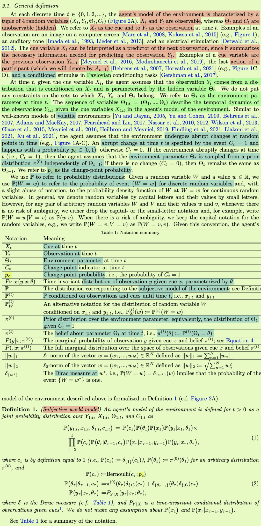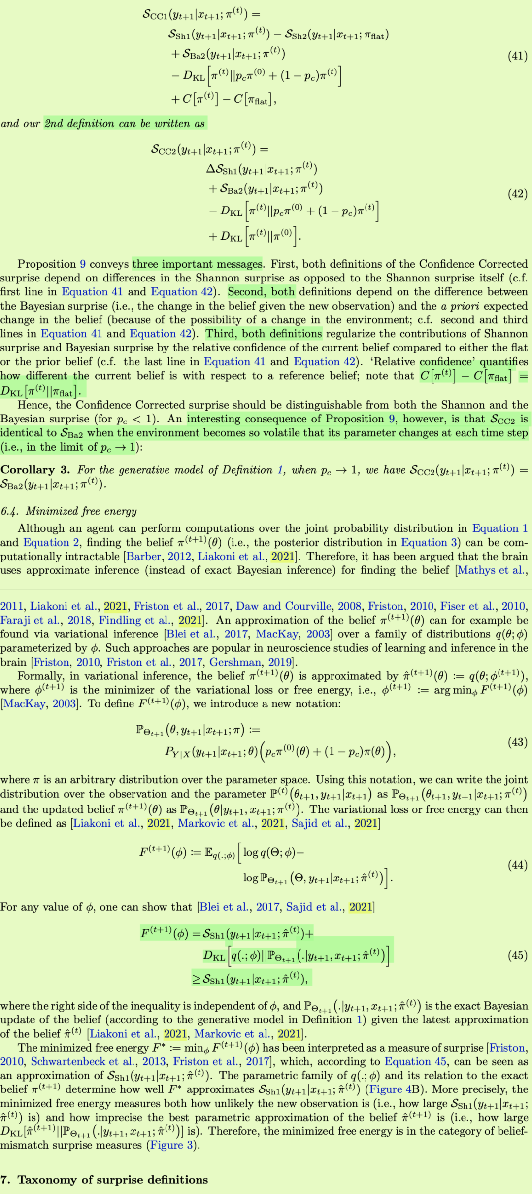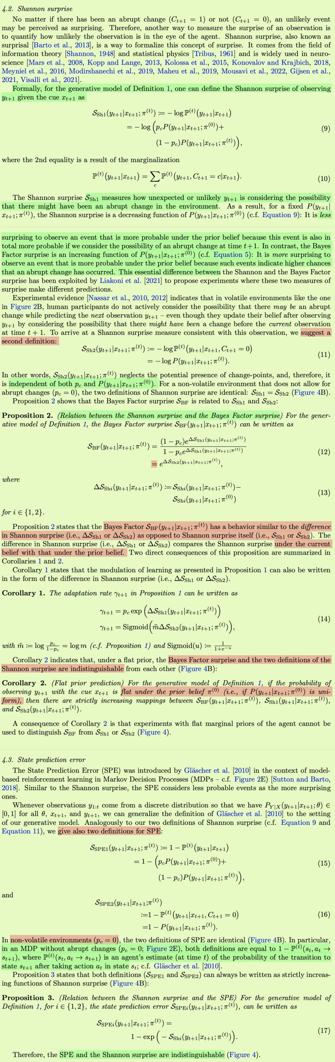 不管是否有突变(Ct+1 = 1)或没有突变(Ct+1 = 0),不可能发生的事件都可能被认为是令人惊讶的。因此,另一种衡量观察结果的惊奇程度的方法是量化该观察结果在代理人眼中的可能性。香农惊喜,也被称为诧异[巴尔托等人,2013],是一种形式化这种惊喜概念的方式。它来自信息论[Shannon,1948]和统计物理学[Tribus,1961]领域,广泛应用于神经科学