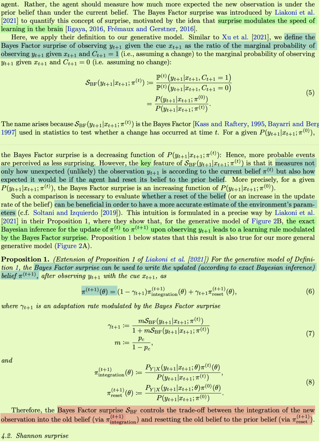 智能体应该衡量在先前的信念下比在当前的信念下对新观察结果的预期高多少。贝叶斯因子惊喜是由 Liakoni 等人提出的。 [2021]量化这种惊喜的概念, 其动机是惊喜调节大脑的学习速度[Iigaya, 2016, Frémaux and Gerstner, 2016]。