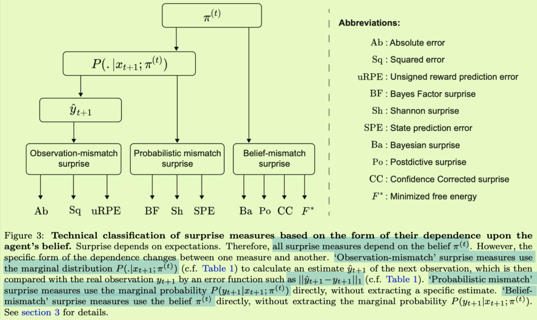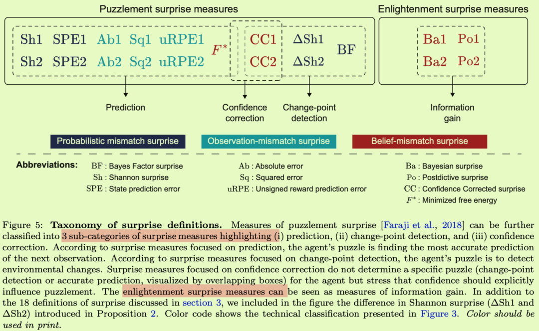 神经科学中的惊讶测量之前被分为两类[Hurley等人,2011,Faraji等人,2018,Gijsen等人,2021]:“困惑”和“启发”惊讶。困惑惊喜衡量的是一个新的观察对一个代理人来说有多困惑,而启发惊喜衡量的是这个新的观察给代理人带来了多少启发并改变了它的信念——这个概念与“啊哈![Kounios和Beeman,2009年,Dubey等人,2021年]。贝叶斯和事后惊奇可以归类为启发惊奇,因为两者都量化了信息增益(图5)。然而,基于我们的理论分析,我们建议将困惑惊讶的测量进一步分为3个子类别(图5