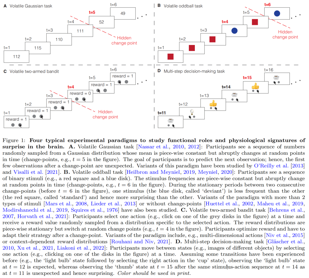 想象一下,某天早上你拉开窗帘,发现你公寓前的街道被新雪覆盖。根据天气预报,如果你期待一个温暖晴朗的早晨,当你看到白色的街道时,你会感到‘惊讶’;惊讶的结果是,你大脑中许多神经元的活动发生变化[Squires等人,1976年,Mars等人,2008年,Kolossa等人,2015年],你的瞳孔扩大[Antony等人,2021年,Preuschoff等人,2011年,Nassar等人,2012年]。惊喜影响着我们对未来的预测和感知,以及我们对过去的记忆。例如,一些研究表明,在下雪的早晨之后,你对未来计划的依赖会减少[等人,2007,Nassar等人,2010,Xu等人,2021]。其他研究预测,在你感到惊讶的那一刻,你会更生动地记得随机走过街道的陌生人的脸[鲁哈尼等人,2018年,鲁哈尼和尼夫,2021年],一些研究预测,这一惊讶的时刻甚至可能会修改你对过去另一个下雪早晨的记忆[格什曼等人,2017年,辛克莱和巴伦西]。为了理解和解释惊讶在不同大脑功能中的计算作用,我们首先需要问“惊讶到底意味着什么?”并形式化我们的大脑是如何感知惊喜的。例如,当你看到白色街道时,你是否会感到“惊讶”,因为你的预期结果是错误的[Meyniel等人,2016年,Faraji等人,2018年,Gl ascher等人,2010年]或者因为你需要改变对天气预报的信任[Baldi,2002年,Schmidhuber,2010年,Liakoni等人,2021年]?