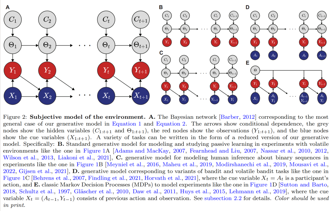 图2:环境的主观模型。a .贝叶斯网络[Barber,2012]对应于等式1和等式2中我们的生成模型的最一般情况。箭头显示条件相关性,灰色节点显示隐藏变量(C1:t+1和θ1:t+1),红色节点显示观察值(Y1:t+1),蓝色节点显示提示变量(X1:t+1)。各种各样的任务可以以我们的生成模型的简化版本的形式来编写。具体来说:b .用于在如图所示的易变环境的实验中建模和研究被动学习的标准生成模型[Adams和MacKay,2007,Fearnhead和Liu,2007,Nassar等人,2010,2012,Wilson等人,2013,Liakoni等人,2021],c .用于在如图所示的实验中建模人类对二进制序列的推理的生成模型[Meyniel等人,2016,Maheu等人,2019,Modirshanechi d .生成模型,对应于类似于图1C中的土匪和易变土匪任务的变量[伯伦斯等人,2007年,芬德林等人,2021年,霍瓦特等人,2021年],其中线索变量Xt = At是参与者的动作,以及e .经典马尔可夫决策过程(MDPs),以模拟类似于图1D中的实验[萨顿和巴尔托,2018年,舒尔茨等人,1997年,Gl ascher等人,2010年,道等人,2011年,Huys 详见第2.2小节。印刷时应使用颜色。
