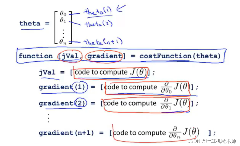 高级优化算法,与梯度下降相比能够大大提高 $logistic$ 回归速度,也使得算法更加适合大型数据集机器学习问题。