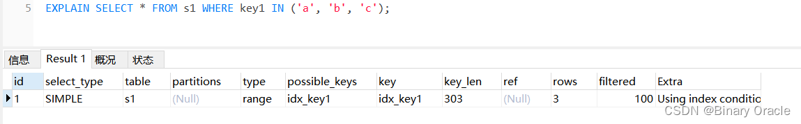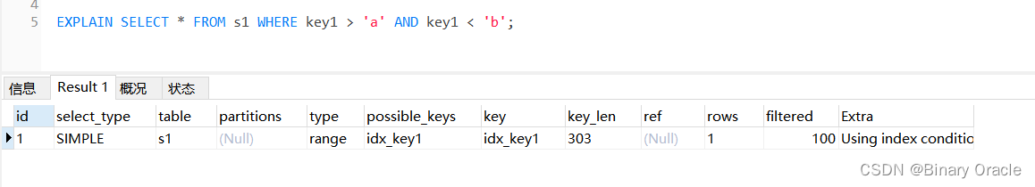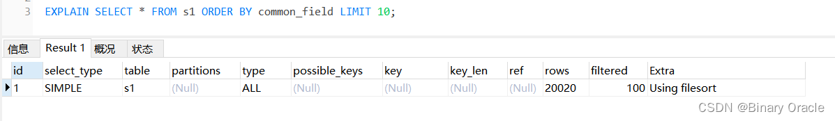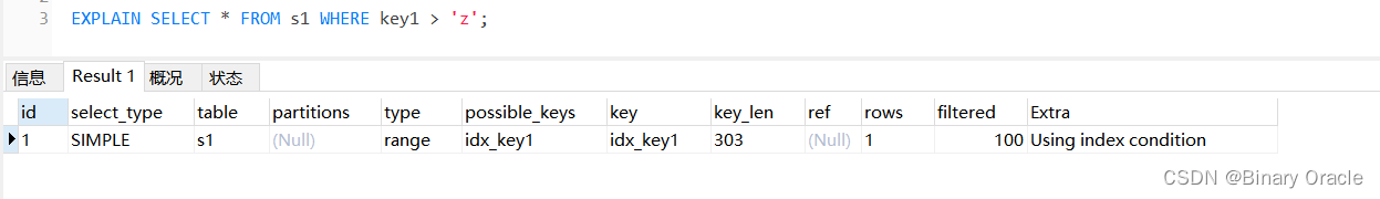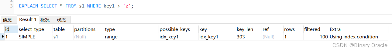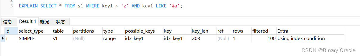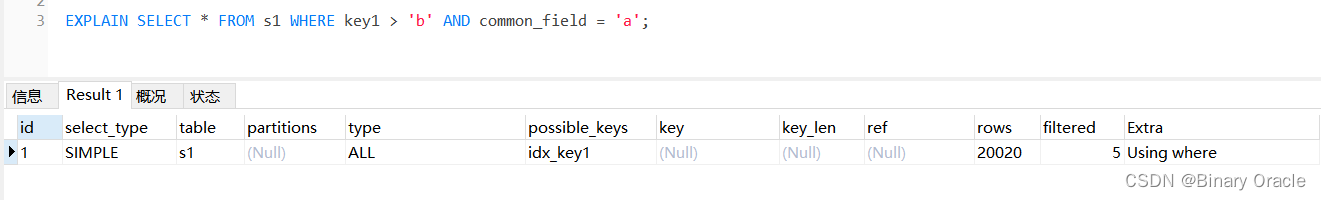 从执行计划的key列中可以看出来,该查询使用idx_key1索引来执行查询,从rows列可以看出满足key1 > 'b’的记录有20020条。执行计划的filtered列就代表查询优化器预测在这20020条记录中,有多少条记录满足其余的搜索条件,也就是common_field = 'a’这个条件的百分比。此处filtered列的值是5.00,说明查询优化器预测在20020条记录中有5.00%的记录满足common_field = 'a’这个条件。