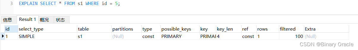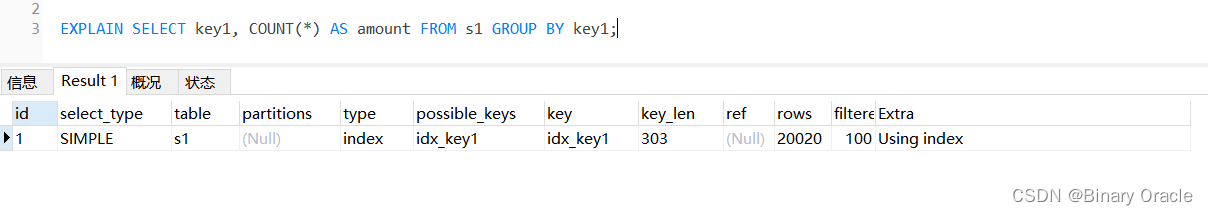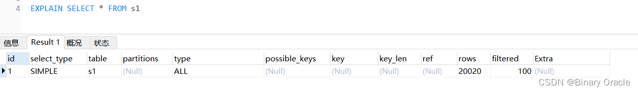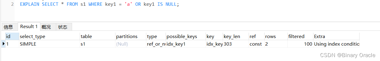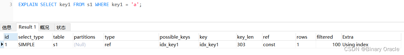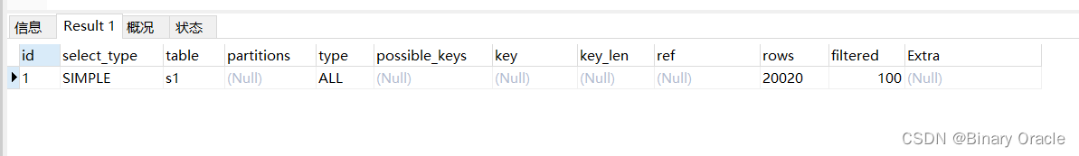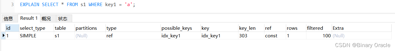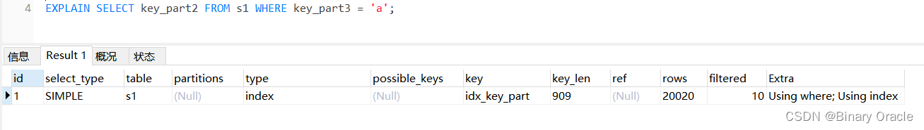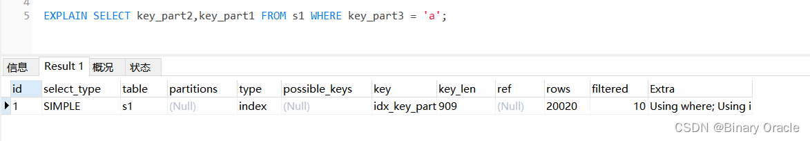 Extra列是用来说明一些额外信息的,我们可以通过这些额外信息来更准确的理解MySQL到底将如何执行给定的查询语句。