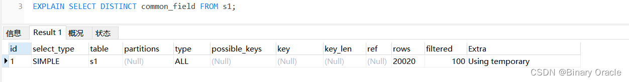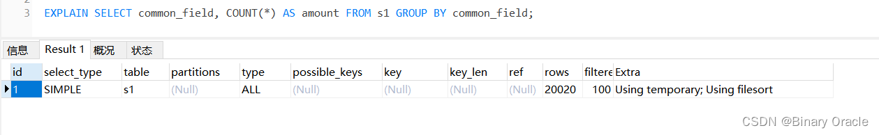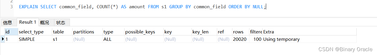 EXPLAIN SELECT common_field, COUNT(*) AS amount FROM s1 GROUP BY common_field ORDER BY common_field;如果我们并不想为包含GROUP BY子句的查询进行排序,需要我们显式的写上ORDER BY NULL,就像这样: