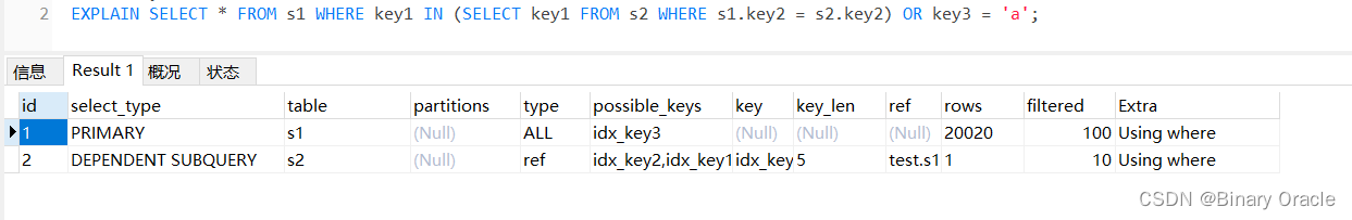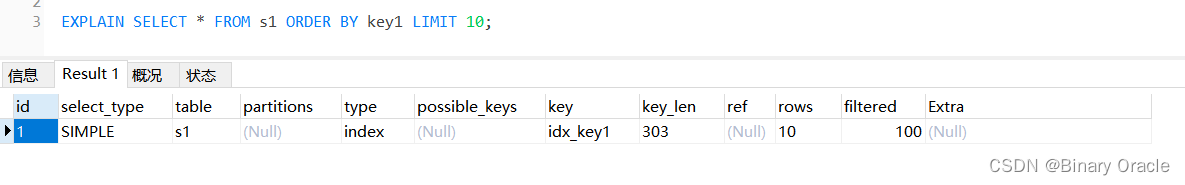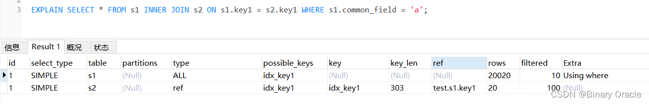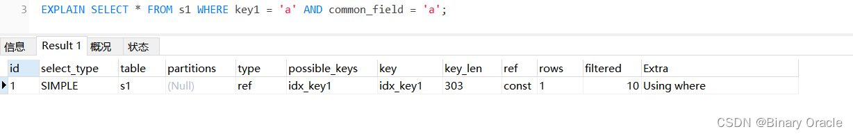 对于单表查询来说,这个filtered列的值没什么意义,我们更关注在连接查询中驱动表对应的执行计划记录的filtered值,比方说下边这个查询: