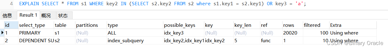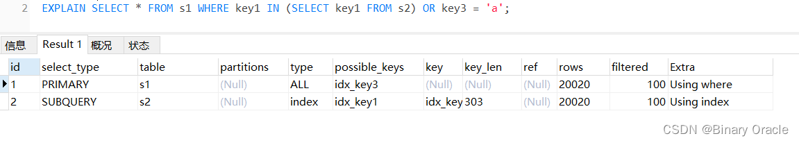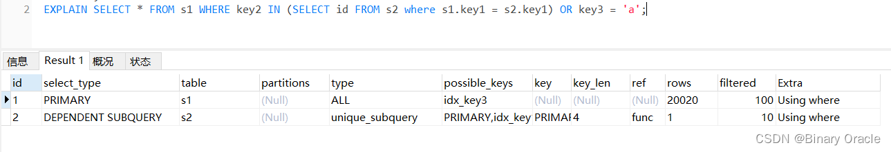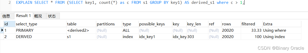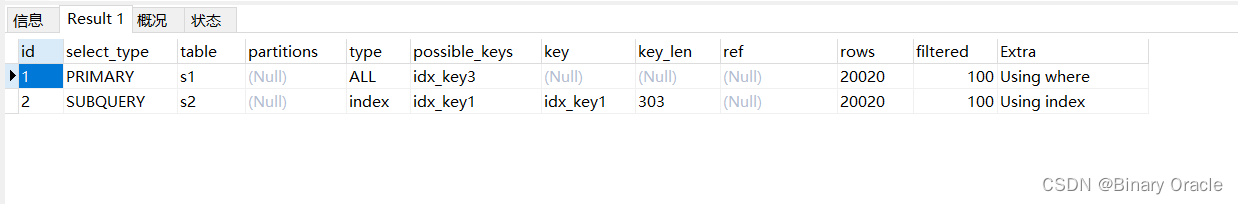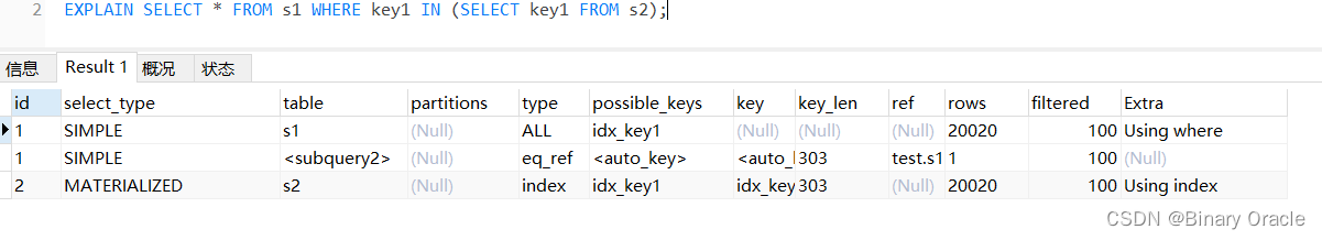 <subquery2>,说明该表其实就是id为2对应的子查询执行之后产生的物化表,然后将s1和该物化表进行连接查询。