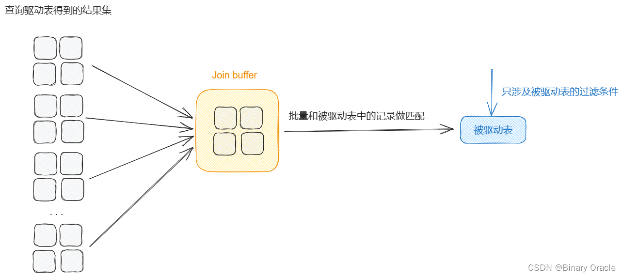 所以我们可不可以在把被驱动表的记录加载到内存的时候,一次性和多条驱动表中的记录做匹配,这样就可以大大减少重复从磁盘上加载被驱动表的代价了。所以设计MySQL的大叔提出了一个join buffer的概念,join buffer就是执行连接查询前申请的一块固定大小的内存,先把若干条驱动表结果集中的记录装在这个join buffer中,然后开始扫描被驱动表,每一条被驱动表的记录一次性和join buffer中的多条驱动表记录做匹配,因为匹配的过程都是在内存中完成的,所以这样可以显著减少被驱动表的I/O代价。使用join buffer的过程如下图所示: