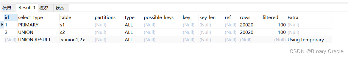 对于union查询,由于mysql需要去重,所以内部需要使用临时表,因此会多出一行id为null的结果: